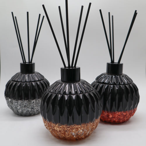 Geurstokjes houder klein rond zwart met goudvlokken